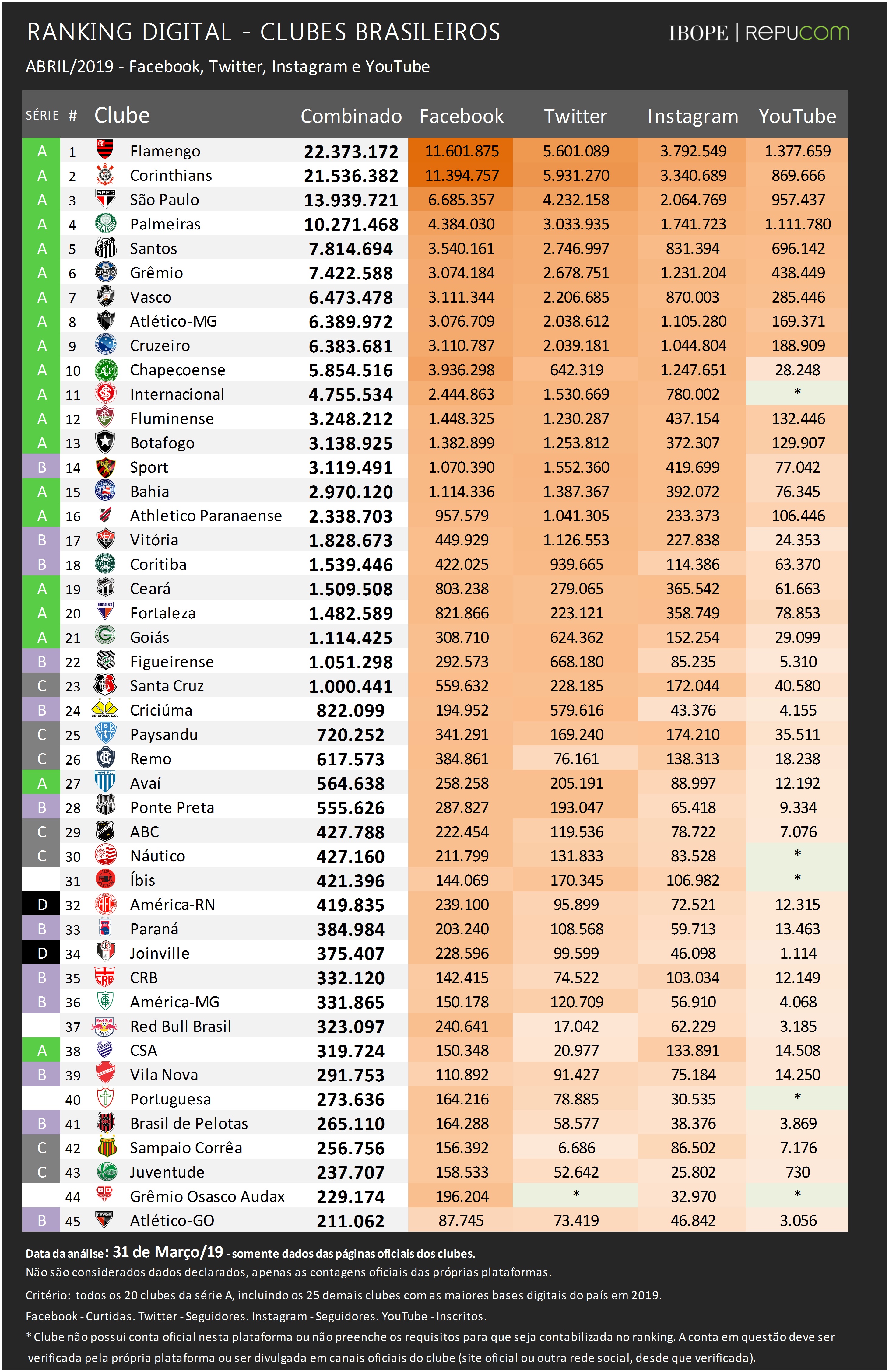 Com o levantamento deste mês, o IBOPE Repucom destaca o crescimento das bases digitais de Flamengo, Corinthians, Atlético Mineiro, Palmeiras e São Paulo, clubes que mais cresceram no período e que juntos correspondem a 55% do total de novos inscritos nas contas de mídias sociais dos clubes brasileiros em março.