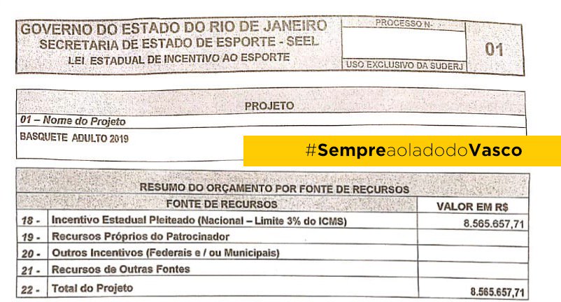 Julio Brant – A imagem se refere a um projeto de ICMS estadual do Rio de Janeiro, protocolado na secretaria de esporte do Rio, com objeto visando montar um time de basquete competitivo para o clube de regatas Vasco da Gama. Foi feito por consultores técnicos experientes do grupo Sempre Vasco, com expertise na área, e experiência em projetos Incentivados em todo o Brasil.