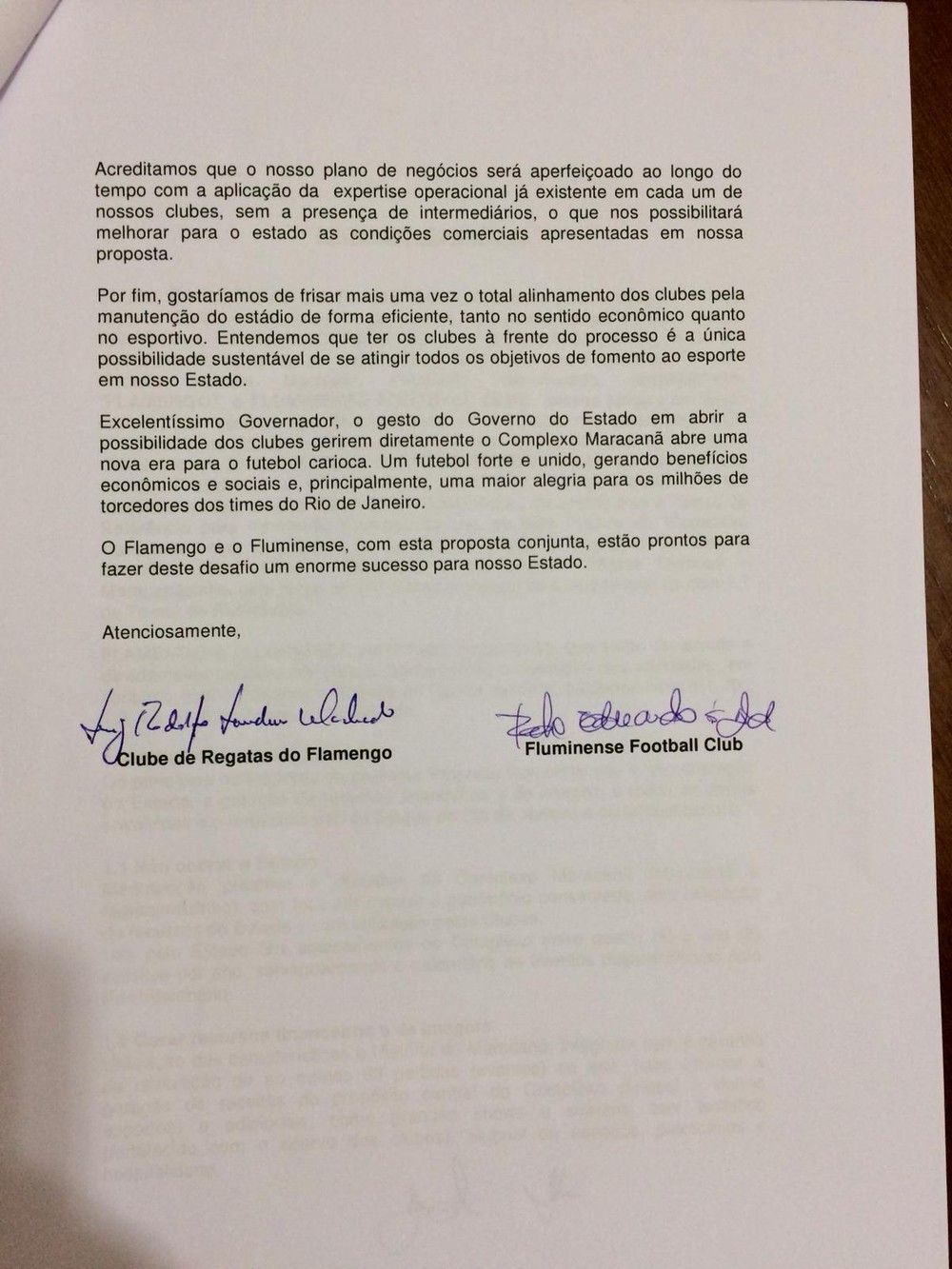 O presidente do Flamengo, Rodolfo Landim, e o do Fluminense, Pedro Abad, entregaram uma proposta conjunta para assumir de forma temporária a administração do Maracanã. O prazo é até esta quinta e o resultado sairá na próxima sexta-feira. Ainda não foram divulgados maiores informações de como seria esta gestão compartilhada. Os dirigentes alegaram sigilo para não divulgarem nenhum detalhe sobre o contrato e nem disseram se o governo participará.
