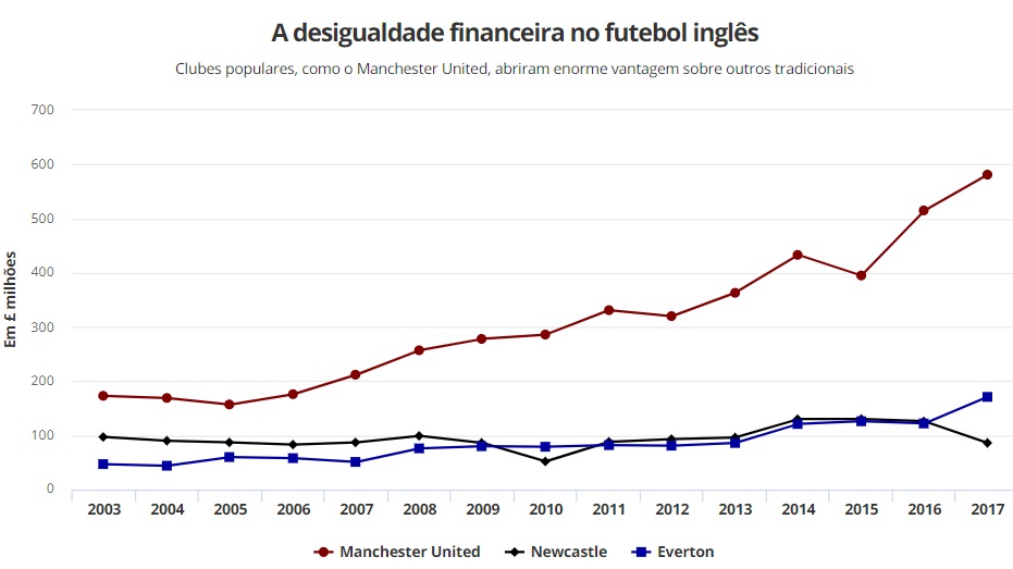 A desigualdade financeira, principal razão da mudança na ordem de grandeza do futebol, não tem ocorrido apenas no Brasil. Perceba no gráfico acima como a diferença nas arrecadações de Manchester United, Newcastle e Everton aumentou brutalmente com o futebol moderno. Esses clubes tinham desempenho esportivo considerável ainda nos anos 1980 e 1990, mas deixaram de disputar títulos na Inglaterra desde que foram deixados para trás por um adversário global, rico e popular.