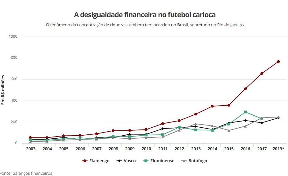 Repare agora, no gráfico acima, como o mesmo fenômeno visto no futebol inglês tem se repetido no carioca. A diferença é que ele começou depois. Enquanto o Flamengo manteve pequena distância entre Botafogo, Fluminense e Vasco até 2012, a partir de 2013 o espaço entre as linhas foi ficando maior. Até chegar ao ponto em que a direção flamenguista projeta um orçamento de R$ 765 milhões em 2019, enquanto adversários têm um terço disso. A desigualdade só aumenta.