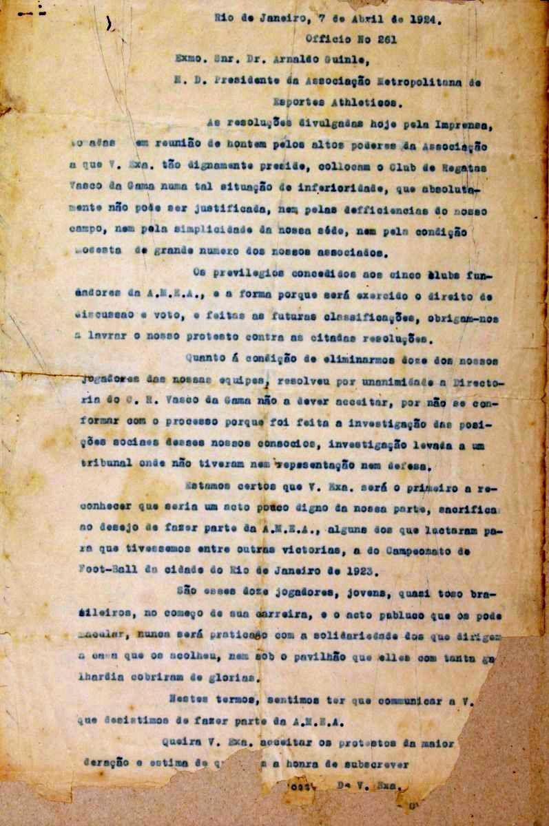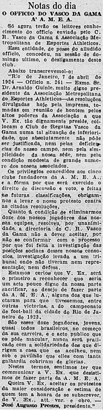 O OFFICIO DO VASCO DA GAMA A' A. M. E. A. Só agora terão os leitores conhe- cimento do officio enviado pelo C. R. Vasco da Gama á Associação Me- tropolitana de Esportes Athleticos. Essa entidade, de posse do alludido officio, concedeu, na sessão de do- mingo ultimo, o desligamento deste club. Abaixo transcrevemol-o: "Rio de Janeiro, 7 de abril de 1924 — Officio n. 261 — Exmo. Sr. Dr. Arnaldo Guinle, muito digno pre- sidente da Associação Metropolitana de Esportes Athleticos—As resoluções divulgadas hoje pela imprensa, to- madas em reunião de hontem pelos altos poderes da Associação a que V. Ex. tão dignamente preside, col- locam o Club de Regatas Vasco da Gama numa tal situação de inferiori- dade, que absolutamente não póde ser justificada, nem pelas deficien- cias do nosso campo, nem pela sim- plicidade da nossa sede, nem pela condição modesta de grande nume- ro dos nossos associados. Os privilégios concedidos aos cinco clubs fundadores da A. M. E. A., e a fórma por que será exercido o direito de discussão e voto, e feitas as futuras classificações, obrigam- nos a levar o nosso protesto contra as citadas resoluções. Quanto á condição de eliminarmos doze dos nossos jogadores das nos- sas equipes, resolveu, por unanimi- dade, a directoria do C. R. Vasco da Gama não a dever aceitar, por não se conformar com o processo por que foi feita a investigação das posições sociaes desses nossos conso- clos, investigação levada a um tri- bunal onde não tiveram nem repre- sentação, nem defesa. Estamos certos que V. Ex. será o primeiro a reconhecer que seria um acto pouco digno da nossa parte sacrificar, ao desejo de fazer parte da A. M. E. A., alguns dos que lu- ctaram para que tivessemos, entre outras victorias, a do campeonato de foot-ball da cidade do Rio de Ja- neiro de 1923. São esses doze jogadores, jovens, quasi todos brasileiros, no começo da sua carreira, e o acto publico que os póde macular, nunca será prati- cado com a solidariedade dos que di- rigem a casa que os acolheu, nem sob o pavilhão que elles com tanta galhardia cobriram de glorias. Nestes termos, sentimos ter que communicar a V. Ex. que desisti- mos de fazer parte da A. M. E. A. Queira V. Ex. aceitar os protestos da maior consideração e estima de quem tem a honra de se subscrever, do V. Ex., att. vnr. e obro. — José Augusto Prestes, presidente."