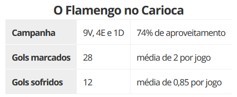 O Rubro-Negro tem a melhor campanha do Carioca, com 74% de aproveitamento, além do ataque mais positivo, com 28 gols marcados. A defesa é um ponto fraco. Ao lado do Fluminense, tem a zaga mais vazada entre os semifinalistas, com média de 0,85 gol sofrido por partida. O destaque ofensivo é Bruno Henrique, sendo artilheiro do time, ao lado de Gabriel, com seis gols, além de ser, ao lado de Everton Ribeiro, quem mais tem assistências, com quatro passes para gol. O atacante ex-Santos participou diretamente de 36% dos gols rubro-negros. Uma boa opção para o ataque do Flamengo é a bola aérea: 13 dos 28 gols do time começaram em jogadas pelo alto (46%).