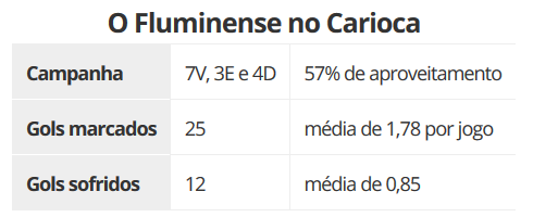 O Tricolor foi o último a conseguir a classificação e chegou às semi graças justamente ao Flamengo, adversário de sábado, que ganhou a Copa Rio. O time de Fernando Diniz tem a pior campanha no Carioca entre os semifinalistas e, ao lado do Flamengo, a pior defesa, com a média de 0,85 gol sofrido por jogo. O destaque individual é Yony González, um dos artilheiros do campeonato, com sete gols, além de ter três assistências, participando diretamente de 40% dos gols do Fluminense. Uma das armas é o lado direito do ataque. Dos 17 gols de bola rolando, 10 começaram por ali (59%).