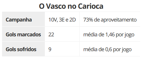 Campeão da Taça Guanabara, a relação atual do Vasco com a torcida não anda das melhores. O que pode ajudar o time a chegar à decisão é o fato de enfrentar o time teoricamente mais fraco das semifinais, precisando do empate. Isso porque, caso não sofra gol, estará classificado, sendo que o Cruz-Maltino tem a melhor defesa do Carioca, com apenas nove gols sofridos. Na frente, o destaque é Marrony, artilheiro do time, com cinco gols, além de ter duas assistências, participando diretamente de 32% dos 22 gols vascaínos no Carioca. Uma ótima opção ofensiva é a bola parada. Oito dos 22 gols (36%) foram marcados a partir de escanteios, falta direta ou pênalti.