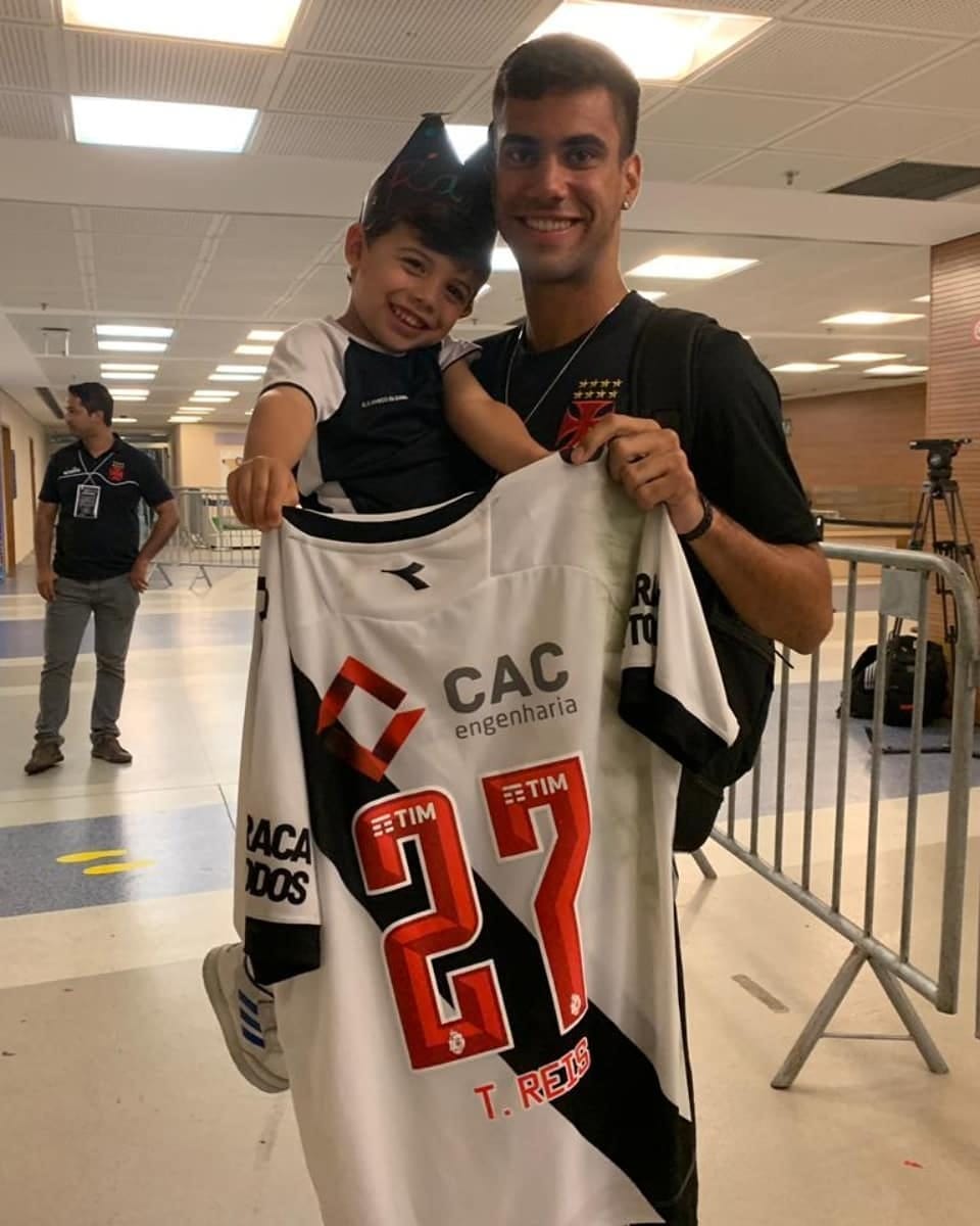 Pequeno vascaíno que improvisou camisa de Tiago Reis recebeu uniforme oficial do atacante