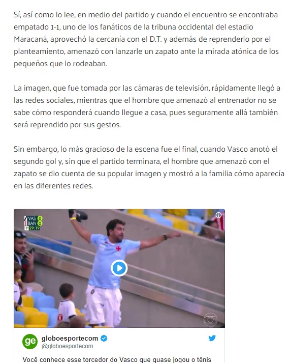 A imagem do torcedor vascaíno que ameaçou jogar seu tênis no campo durante o jogo Vasco x Bangu, semifinal do Estadual, repercutiu na imprensa no exterior. Veja abaixo a repecussão no site hispânico FutbolRed.
