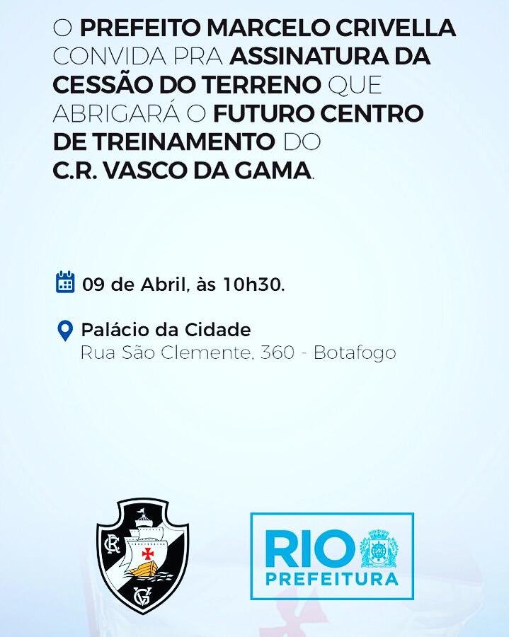Veja convite da cerimônia desta 3ª que marcará a assinatura da cessão de terreno em Jacarepaguá para Vasco ter seu CT