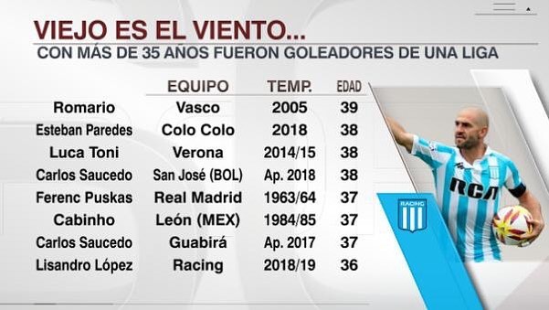 Así lo graficó ESPN, quienes armaron un listado de los jugadores que alguna vez fueron goleadores de alguna liga con más de 35 años edad, donde Lisandro López destacó y además con un chileno en el segundo lugar.