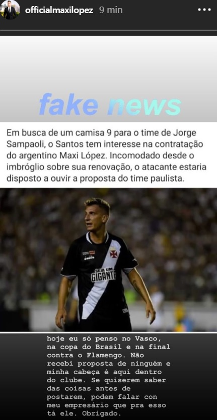 "hoje eu só penso no Vasco, na copa do Brasil e na final contra o Flamengo. Não recebi proposta de ninguém e minha cabeça é aqui dentro do clube. Se quiserem saber das coisas antes de postarem, podem falar con meu empresário, que pra esso tá ele. Obrigado."