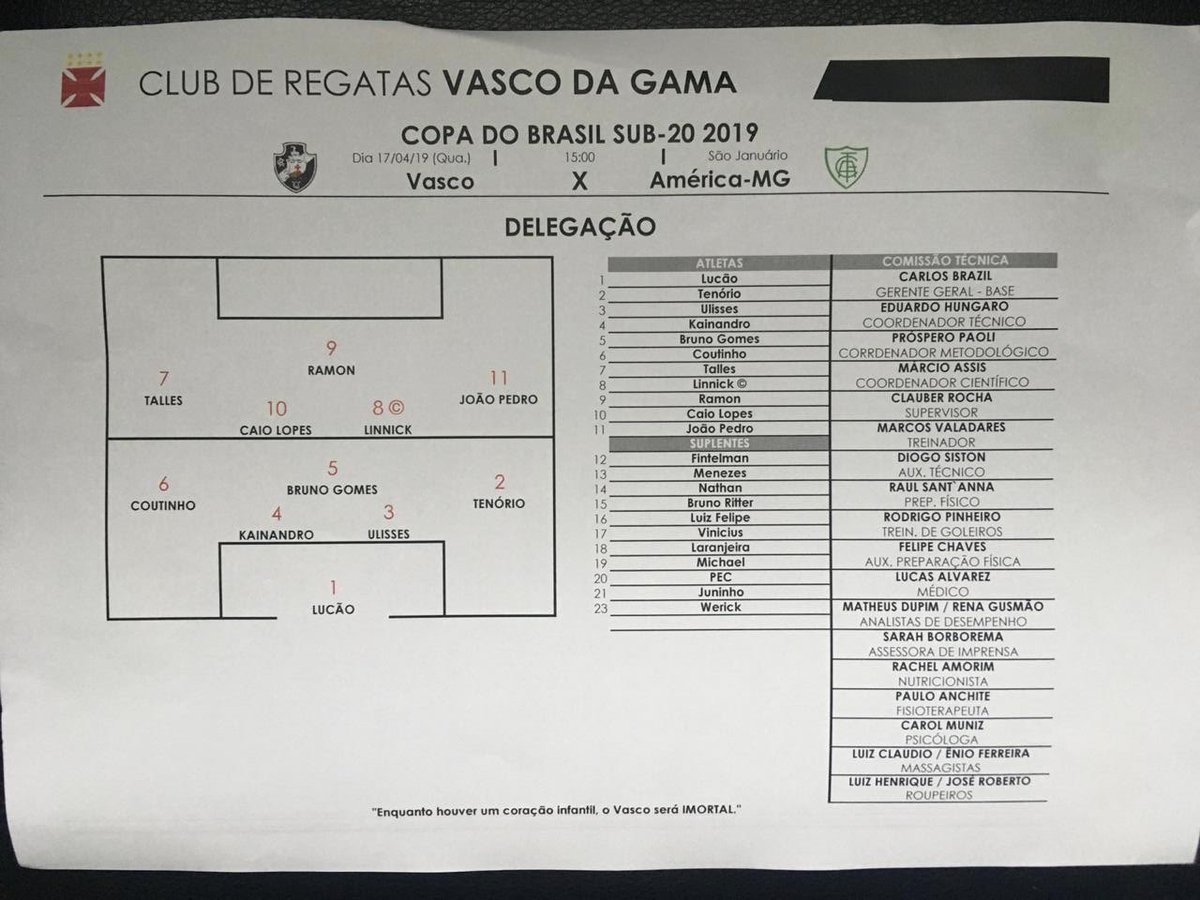 COPA DO BRASIL SUB-20: Vasco escalado para enfrentar o @AmericaMG, pela Copa do Brasil Sub-20, em São Januário: Lucão; Cayo, Ulisses, Kainandro e Coutinho; Bruno Gomes, Caio Lopes e Linnick(C); João Pedro, Talles Magno e Ramon. Técnico: Marcos Valadares