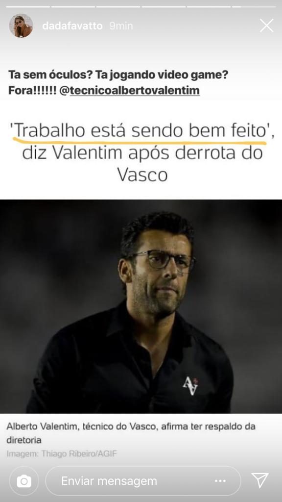 Por meio dos Stories do Instagram, a filha de Romário reproduziu uma notícia que trazia uma frase do treinador: "Trabalho está sendo bem feito". Indignada, Dada escreveu: "Tá sem óculos? Tá jogando videogame? Fora!"