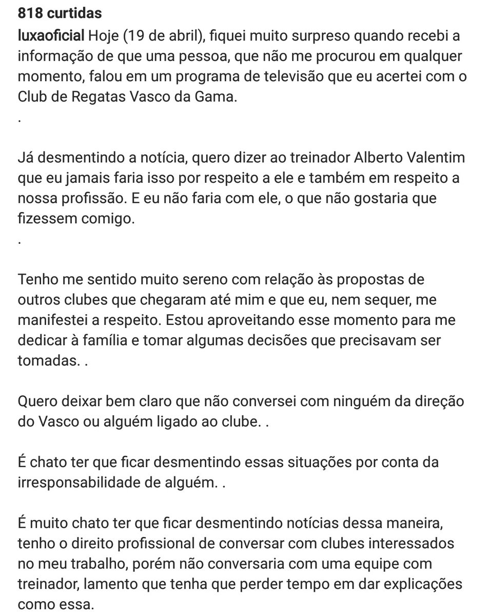Fonte: Instagram do treinador Vanderlei Luxemburgo