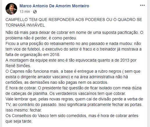 Palavras do Grande Benemérito Marco Antonio Monteiro, ex Vice-Presidente de Comunicação do Vasco #Vasco #FLAxVAS