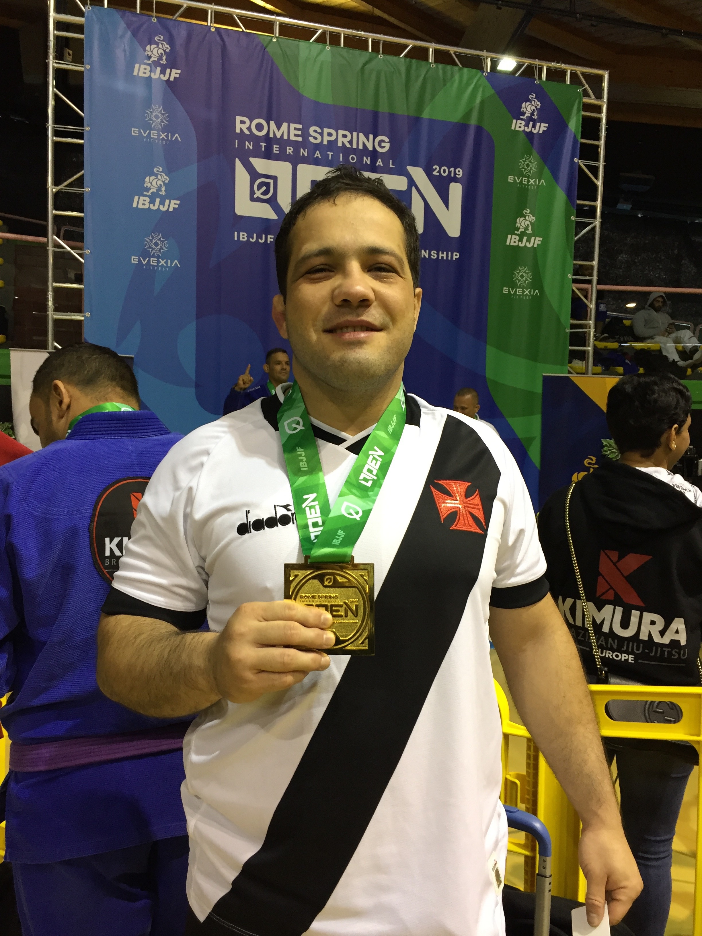 Campeão do Roma Spring de jiu-jitsu, lutador Leonardo Cabral sobe ao pódio com a camisa do Vasco