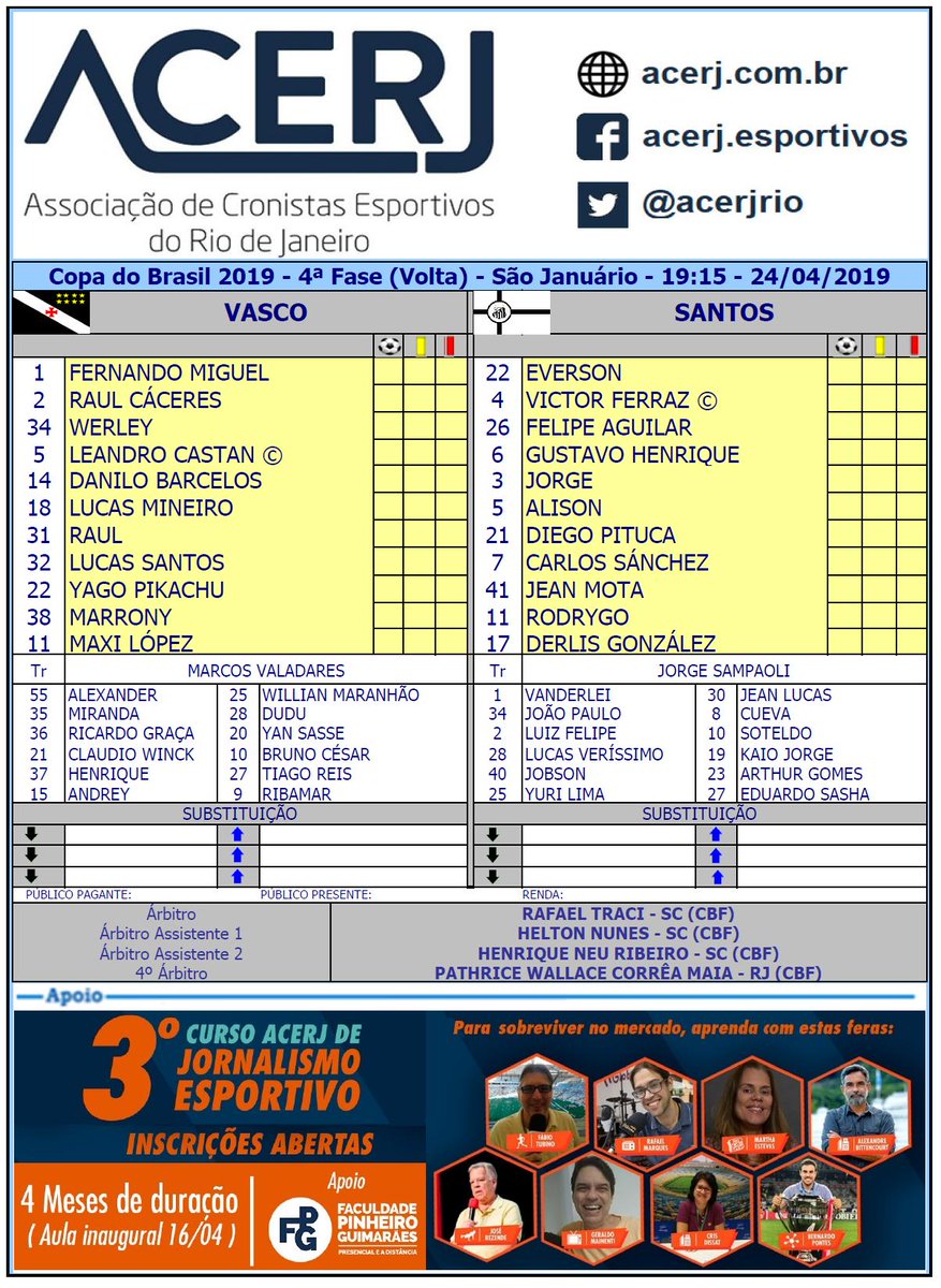 Escalações de Vasco e Santos pela 4ª Fase (Volta) da Copa do Brasil 2019 em São Januário #acerjinforma #VASxSAN #CopadoBrasil2019 #CopaDoBrasil