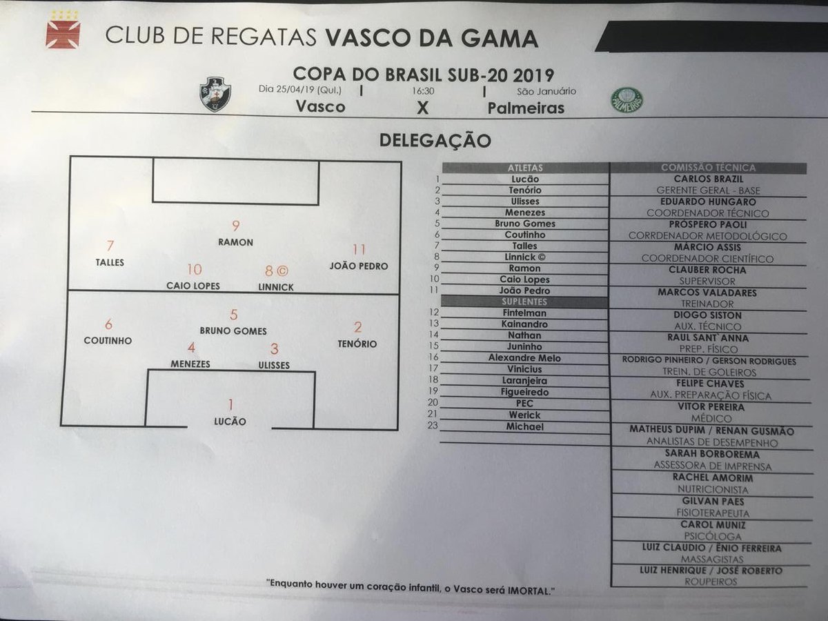 Vasco escalado para enfrentar o Palmeiras, pela semifinal da Copa do Brasil Sub-20, em São Januário: Lucão; Cayo Tenório, Ulisses, Menezes e Coutinho; Bruno Gomes, Caio Lopes e Linnick(C); João Pedro, Talles Magno e Ramon. Técnico: Diego Siston #CopadoBrasilSub20 #VASAxPAL