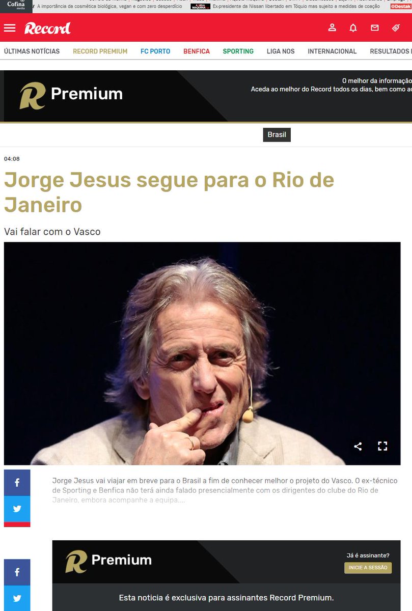 REVIRAVOLTA? Jornal português Record informou na madrugada de hoje (26/04) que o treinador Jorge Jesus virá ao Brasil conhecer melhor o projeto do @VascodaGama.