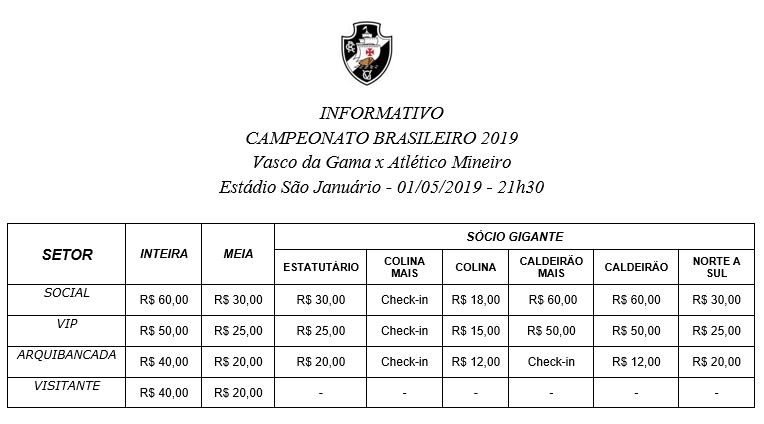 Torcida Vasco: Dia 28/04 às10h, até 01/05 às 12h.