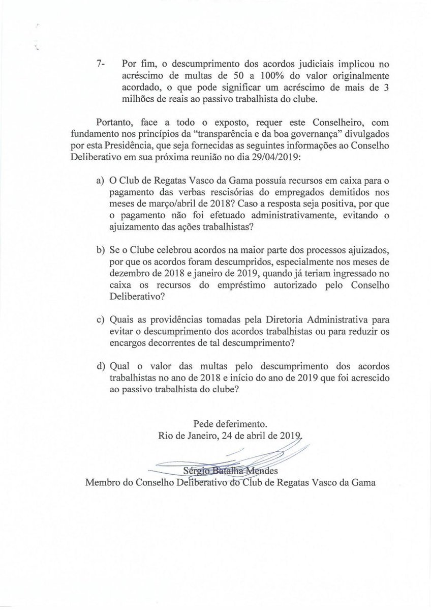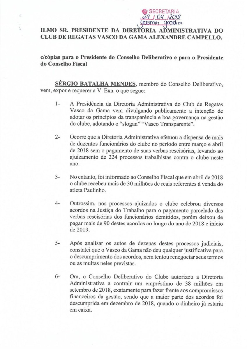 Conselheiro protocola questionamento à Campello sobre descumprimento de acordos trabalhistas. #Vasco #VascoDaGama