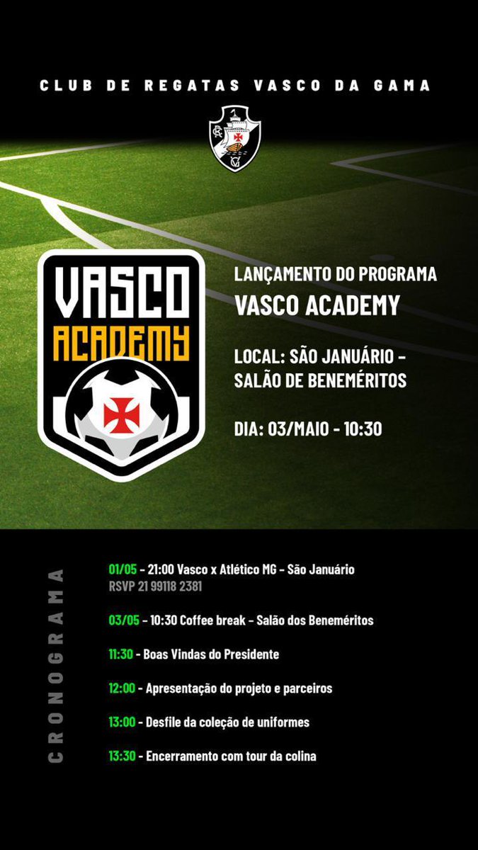 O Vasco vai lançar na sexta o projeto "Vasco Academy". Segundo o clube, "esta será a única escola de futebol do país a capacitar e replicar toda a metodologia de alto rendimento utilizada nos treinamentos de base do clube para suas escolas licenciadas". #gevas