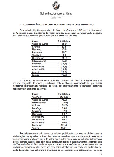 O resultado líquido apurado pelo Vasco da Gama em 2018 foi o maior entre
