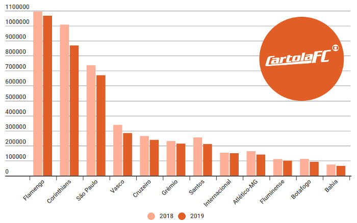 O Cartola FC chega à 15ª edição no Brasileirão de 2019. Já na largada, 4,8 milhões de pessoas inscritas no popular fantasy game do portal globoesporte – é bastante gente, mas ainda assim, houve uma redução de 600 mil cadastros em relação à temporada passada, considerando a primeira rodada. Aqui, o interesse do blog está na quantidade de torcedores inscritos nas ligas oficiais dos clubes presentes, as chamadas "ligas clássicas" – pois cada "cartoleiro" só pode se inscrever na liga do time do coração, escolhido no cadastro. Um radar para alimentar o debate.