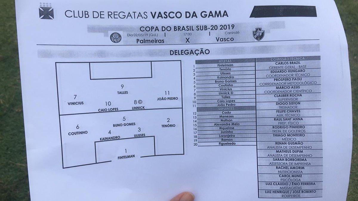 Vasco escalado para enfrentar o Palmeiras, pela semifinal da Copa do Brasil Sub-20, em São Paulo: Fintelmann; Cayo Tenório, Ulisses, Kainandro e Coutinho; Bruno Gomes, Caio Lopes e Linnick(C); João Pedro, Vinicius e Talles. Técnico: Diogo Siston #CopadoBrasilSub20 #PALxVAS