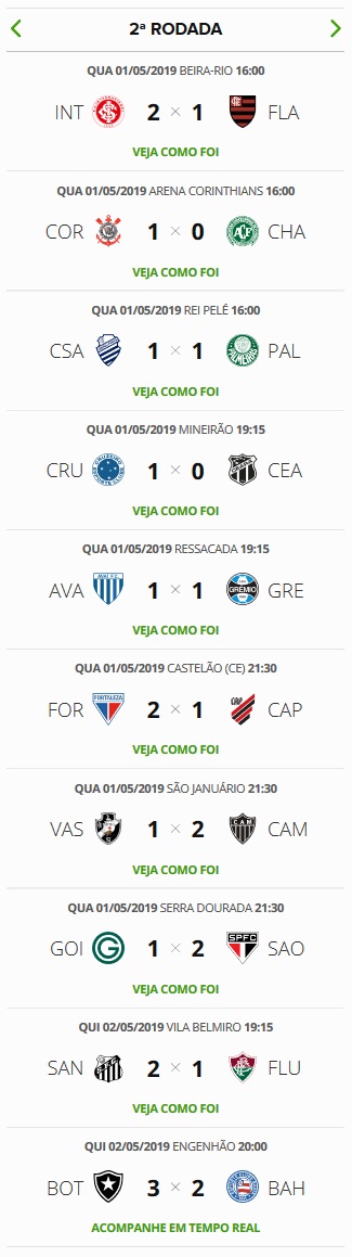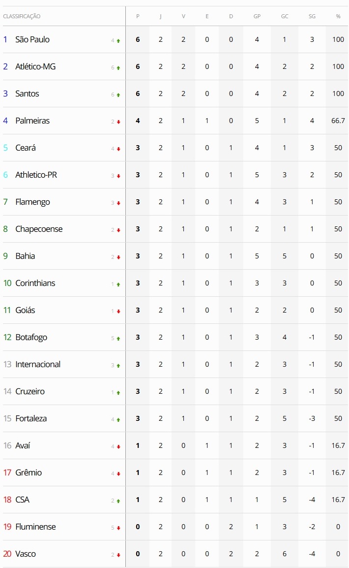 Terminada a 2ª rodada do Campeonato Brasileiro, o Vasco, que perdeu para o Atlético-MG por 2 a 1, caiu da 18ª para a 20ª e última colocação.