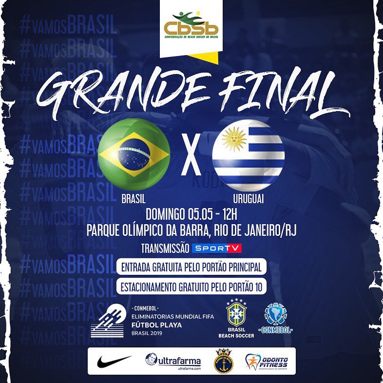 Neste domingo (5/5), às 12h, tem 🇧🇷 x 🇺🇾 na FINAL das Eliminatórias Sul-Americanas da Copa do Mundo FIFA de Beach Soccer! Vista sua camisa amarela e venha ao Parque Olímpico da Barra vibrar com nossos craques!! 🇧🇷🇧🇷🇧🇷
