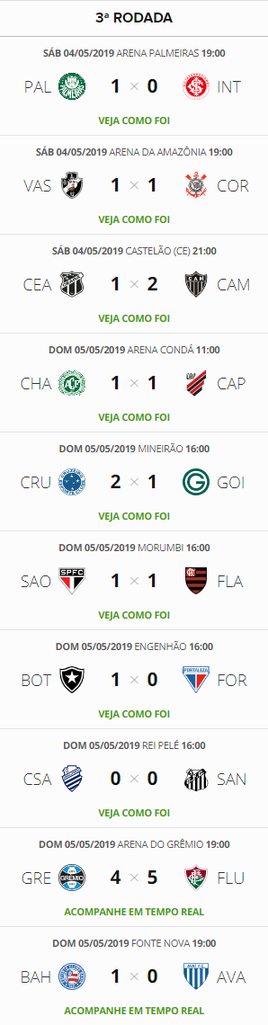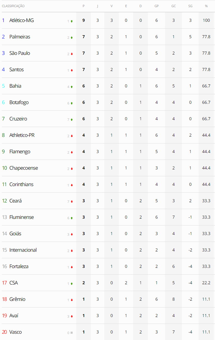 Terminada a 3ª rodada do Campeonato Brasileiro, o Vasco, que empatou com o Corinthians por 1 a 1, segue na 20ª e última colocação.