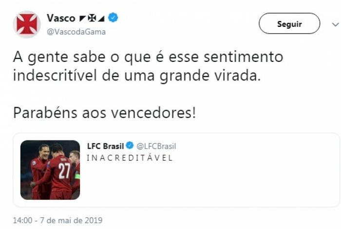 "A gente sabe o que é esse sentimento indescritível de uma grande virada. Parabéns aos vencedores!", escreveu o perfil do Vasco, fazendo menção ao título da Mercosul de 2000, quando perdendo por 3 a 0 para o Palmeiras, em São Paulo, a equipe vascaína comandada por Romário e Juninho Paulista virou o marcador contra o Verdão.