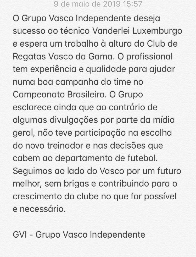 Grupo Vasco Independente, por meio de nota, esclarece que não participou de indicação do técnico Vanderlei Luxemburgo.