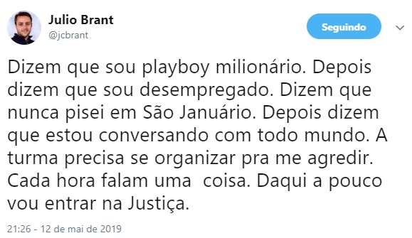 Dizem que sou playboy milionário. Depois dizem que sou desempregado. Dizem que nunca pisei em São Januário. Depois dizem que estou conversando com todo mundo. A turma precisa se organizar pra me agredir. Cada hora falam uma coisa. Daqui a pouco vou entrar na Justiça.