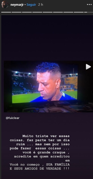 "Muito triste ver essas coisas, faz parte ter um dia ruim, mas nem por isso pode fazer essas coisas. Você é grande, craque, acredite em quem acreditou em você no começo: sua família e seus amigos de verdade!", escreveu Neymar em seu perfil no Instagram.