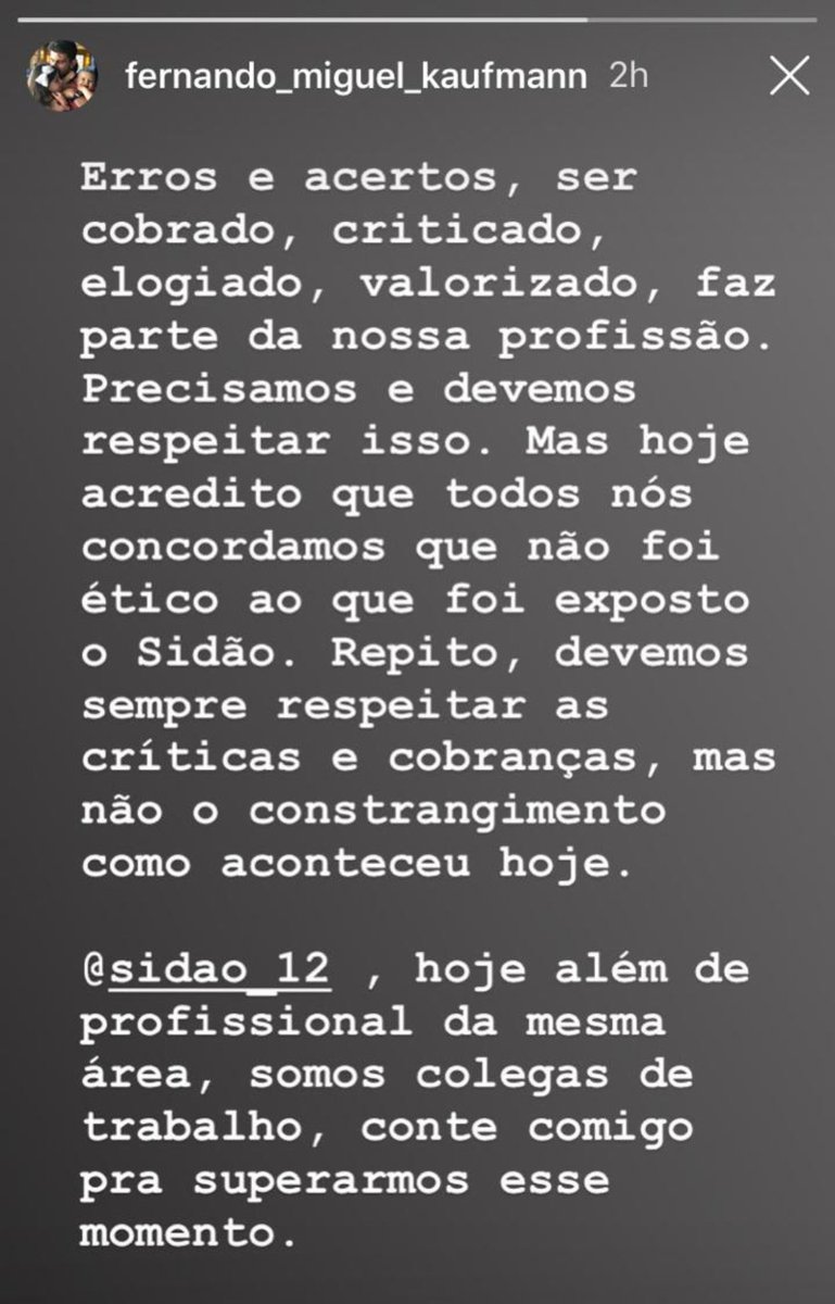 Fernando Miguel posta mensagem para Sidão: 'Conte comigo para superarmos esse momento'