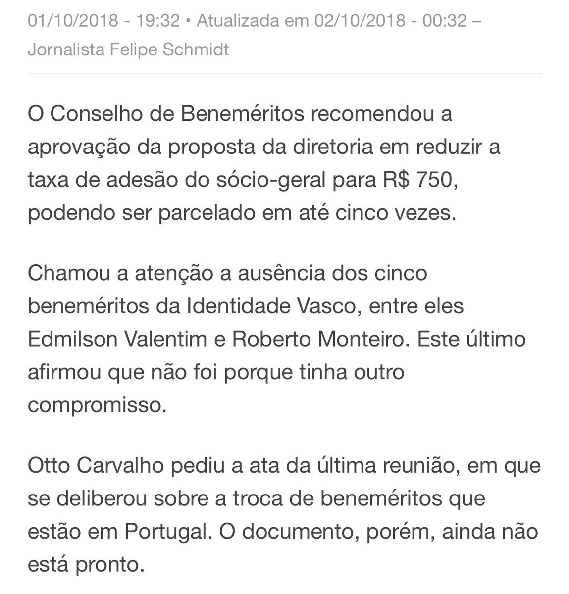 Aproveitando a campanha do @juventudevasco, venho publicamente, já que por meios internos não somos atendidos, cobrar posicionamento sobre a recomendação feita pelo CB em 01/10/2018, para a redução do socio geral para R$ 750,00.