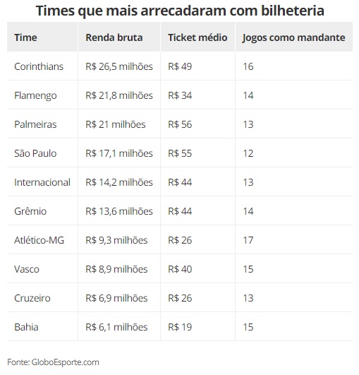Ninguém supera o Corinthians em 2019 quando o assunto é arrecadação com bilheteria. O Timão tem a maior renda bruta e também a melhor média de renda por partida. Em 16 jogos como mandante, o clube teve uma receita total de R$ 26,5 milhões, com uma média de R$ 1,66 milhão por partida. O ticket médio cobrado pelo Corinthians é de R$ 49, mas a diretoria do clube paulista vai reduzir o preço dos ingressos após receber críticas. Confira abaixo os 10 times que mais arrecadaram com renda na temporada.