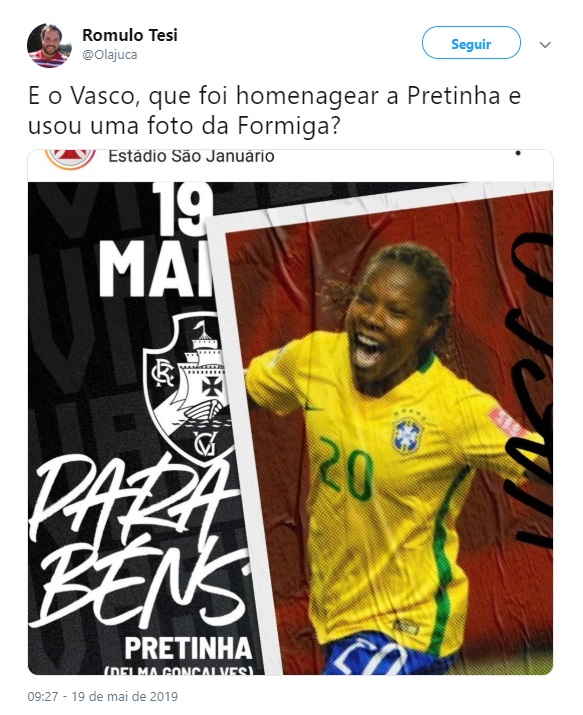 O Vasco homenageou a ex-jogadora Pretinha nas redes sociais pelo seu aniversário. O problema foi que a comunicação do clube colocou a foto da jogadora Formiga em vez da aniversariante, gerando críticas dos torcedores.
