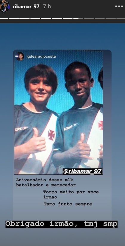 Aniversariante do dia, Ribamar compartilhou no stories do seu Instagram diversas lembranças e mensagens de parabéns de amigos. Numa delas, antiga, ele aparece com uma camisa do Vasco. Veja:
