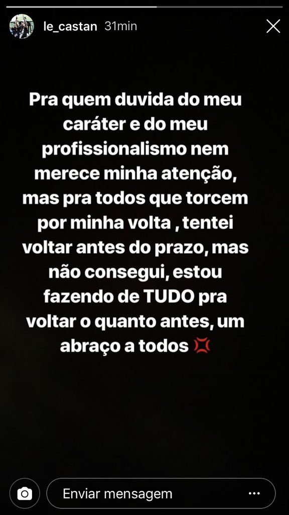 Pra quem duvida do meu caráter e do meu profissionalismo nem merece minha atenção, mas pra todos que torcem por minha volta , tentei voltar antes do prazo, mas não consegui, estou fazendo de TUDO pra voltar o quanto antes, um abraço a todos 💢