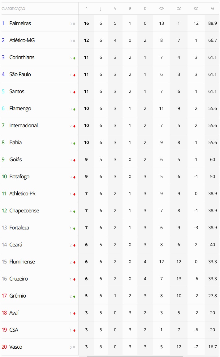 Terminados os jogos do fim de semana da 6ª rodada do Brasileiro, o Vasco, que empatou com o Fortaleza por 1 a 1, segue na 20ª e última colocação.