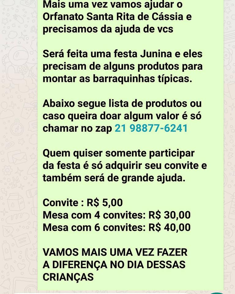 Abaixo segue lista de produtos ou caso queira doar algum valor é só chamar no zap 21 98877-6241