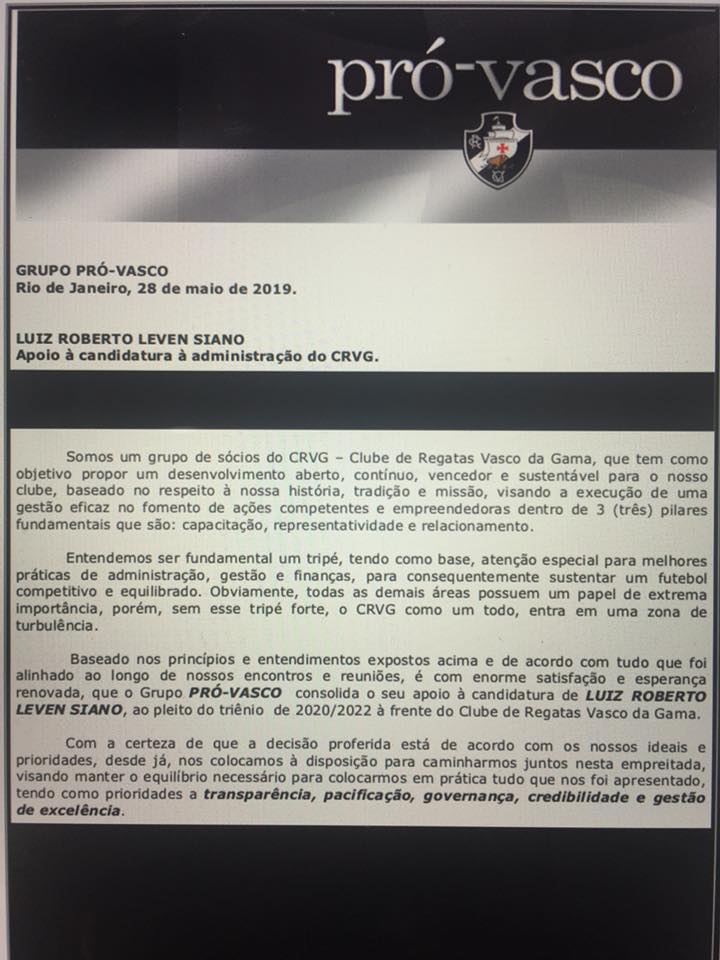 O Grupo Pró-Vasco decidiu no dia de ontem (28/mai/2019) que caminhará junto ao Sr. Leven Siano no intuito da construção de uma candidatura sólida para o triênio 2020/2022.