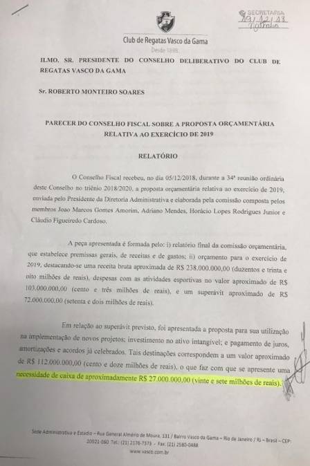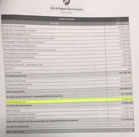 Os conselheiros do Vasco não podem reclamar de surpresa em relação ao empréstimo de R$ 30 milhões que o presidente Alexandre Campello tenta obter para pagar salários e compromissos. A previsão orçamentária do clube de São Januário para 2019, votada no último dia 26 de dezembro, já constava a demanda de R$ 26,9 milhões na rubrica "Necessidade de Caixa". O orçamento foi aprovado por unanimidade.