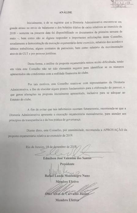 Otto de Carvalho Júnior, membro do Conselho Fiscal, lembrou que o órgão também aprovou por unanimidade a previsão orçamentária da gestão Campello. No parecer encaminhado na ocasião para Roberto Monteiro, presidente do Conselho Deliberativo, o CF já indicou a Monteiro a necessidade dos R$ 27 milhões.