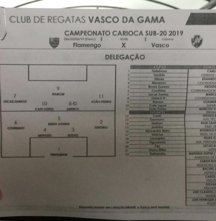 Vasco escalado para enfrentar o Flamengo, pelo jogo de ida da final da Taça Guanabara Sub-20, na Gávea: Fintelman; Cayo Tenório, Ulisses, Menezes e Coutinho; Bruno Gomes, Caio Lopes e Linnick(C); João Pedro, Lucas Santos e Ramon. Técnico: Marcos Valadares #TGSub20 #FLAxVAS