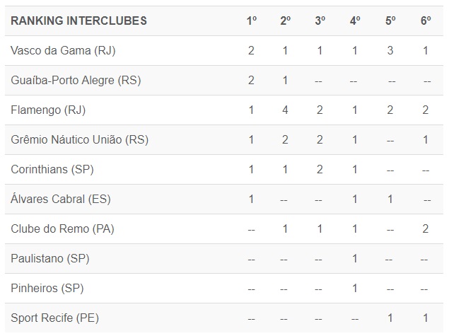 O trabalho de base da Divisão de Desportos Náuticos do Vasco segue dando frutos. O Cruzmaltino foi o campeão da segunda fase da primeira etapa do Campeonato Brasileiro Interclubes de Jovens Talentos, realizado no último fim de semana. Ao todo, 141 atletas de 14 clubes estavam inscritos nas 20 provas das categorias Juvenil (13 e 14 anos), Júnior B (15 e 16 anos) e Júnior A (17 e 18 anos). As disputas acontecerem na raia da Ilha do Pavão, sede do Grêmio Náutico União.
