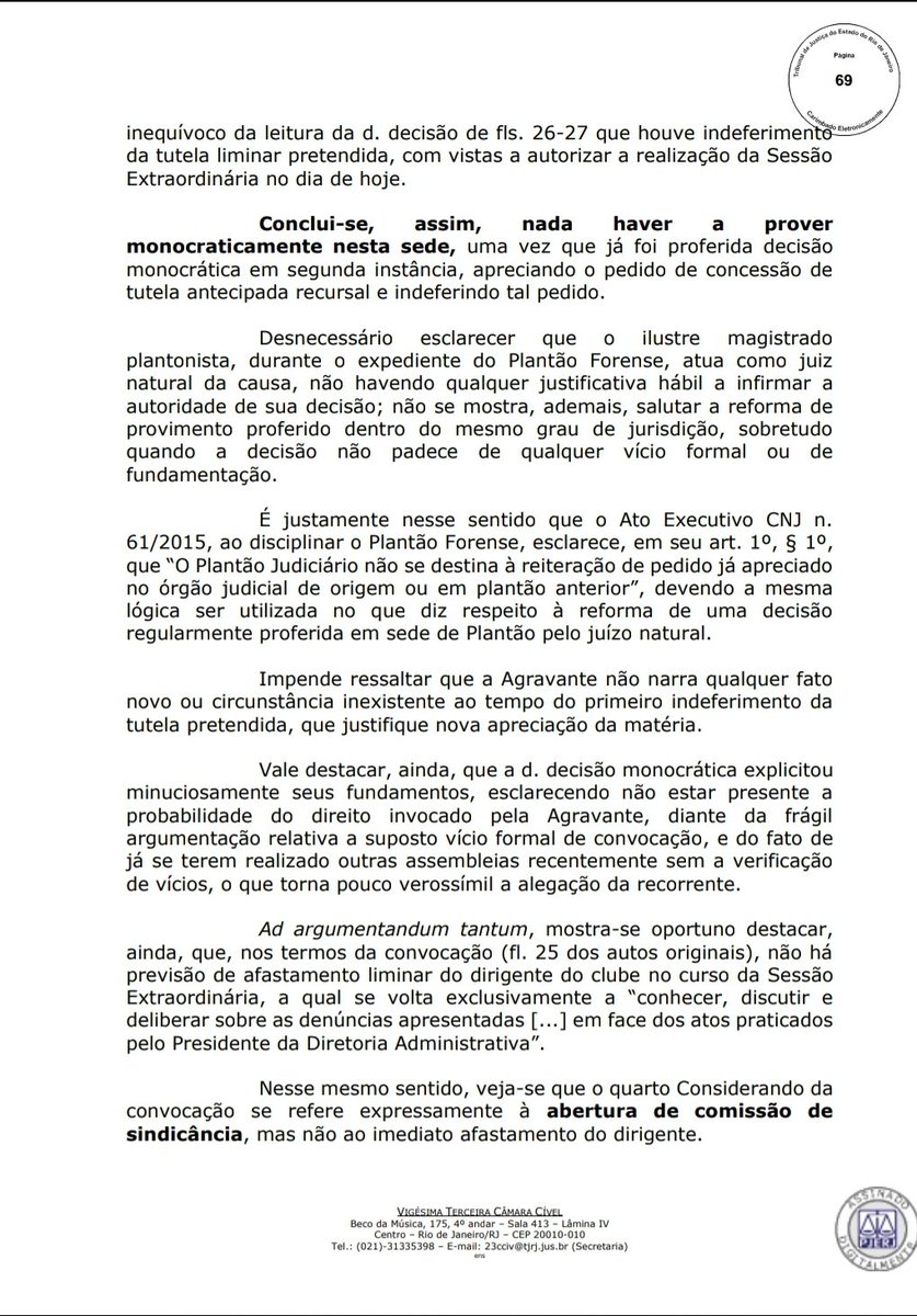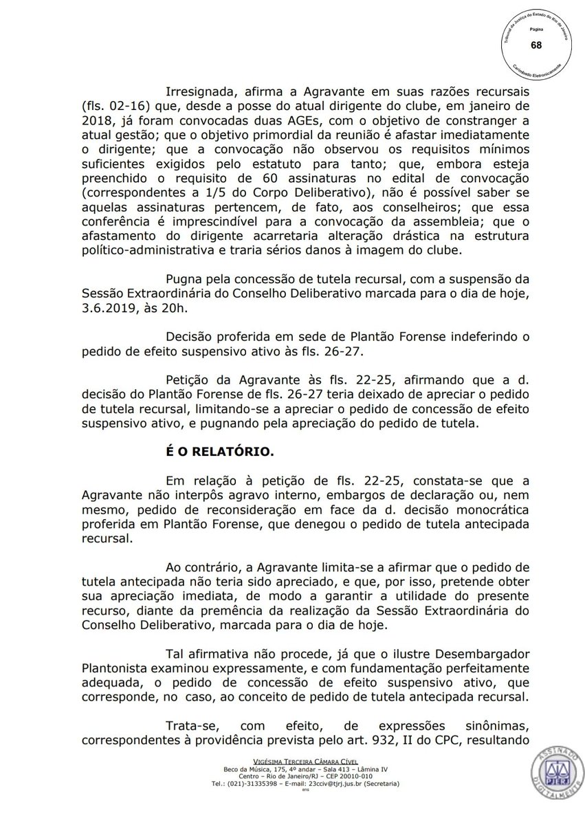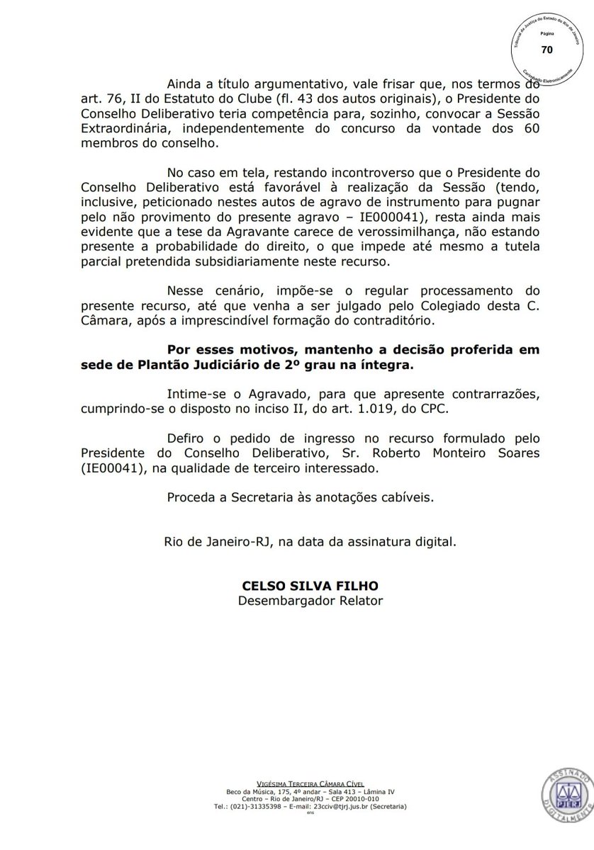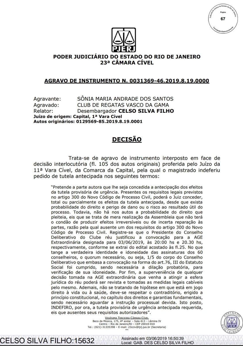 ATENÇÃO! Desembargador relator Celso Silva Filho, 23a Câmara Cível do TJRJ, nega recurso de Sônia Andrade, 2a vice geral do Vasco, e mantém a reunião do Conselho Deliberativo do clube programada para esta noite. Espia a íntegra com os devidos argumentos do magistrado #lanceVAS