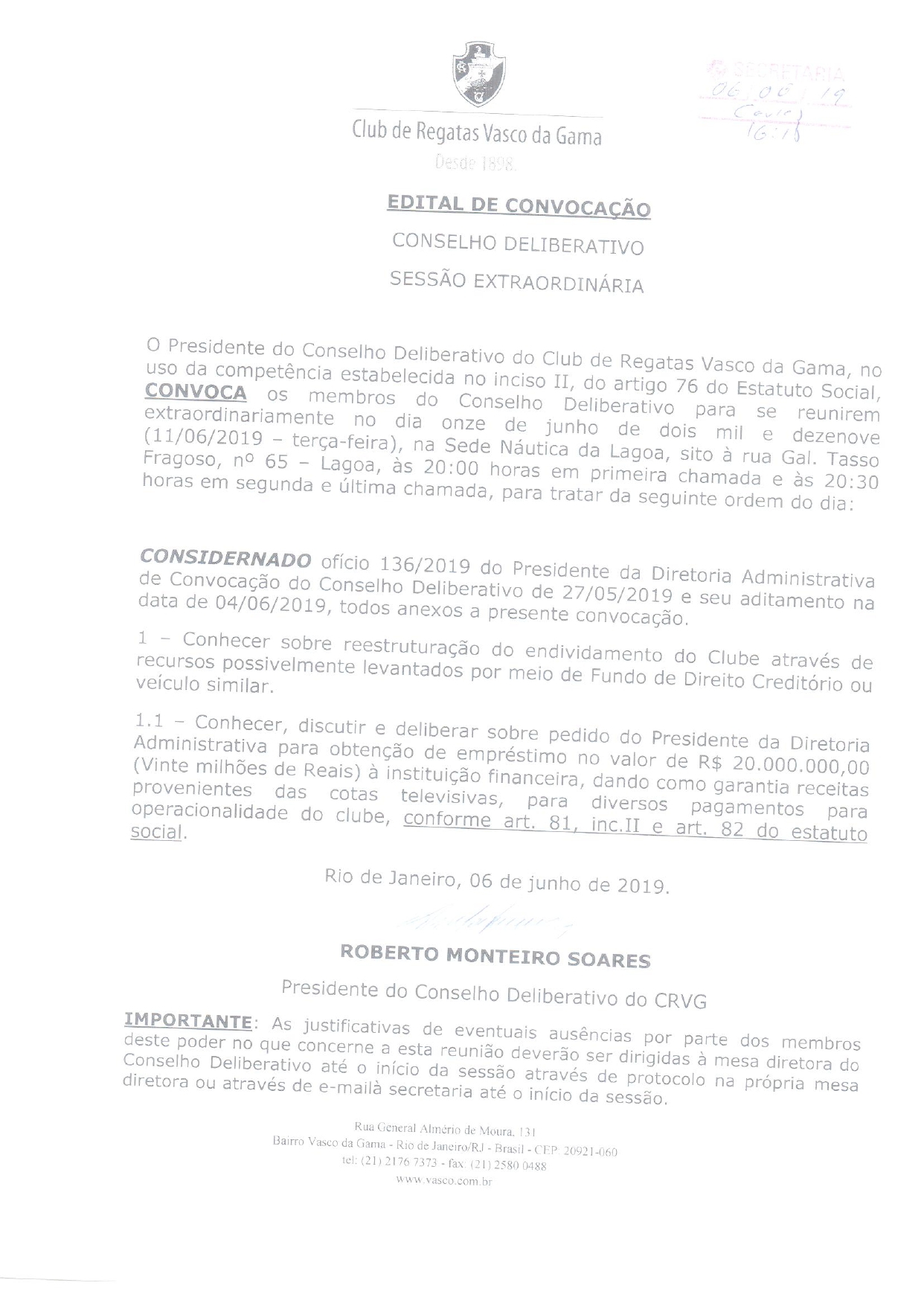 Roberto Monteiro convocou nova reunião do CD do Vasco para a próxima terça (11) com o intuito de deliberar 2 temas:
